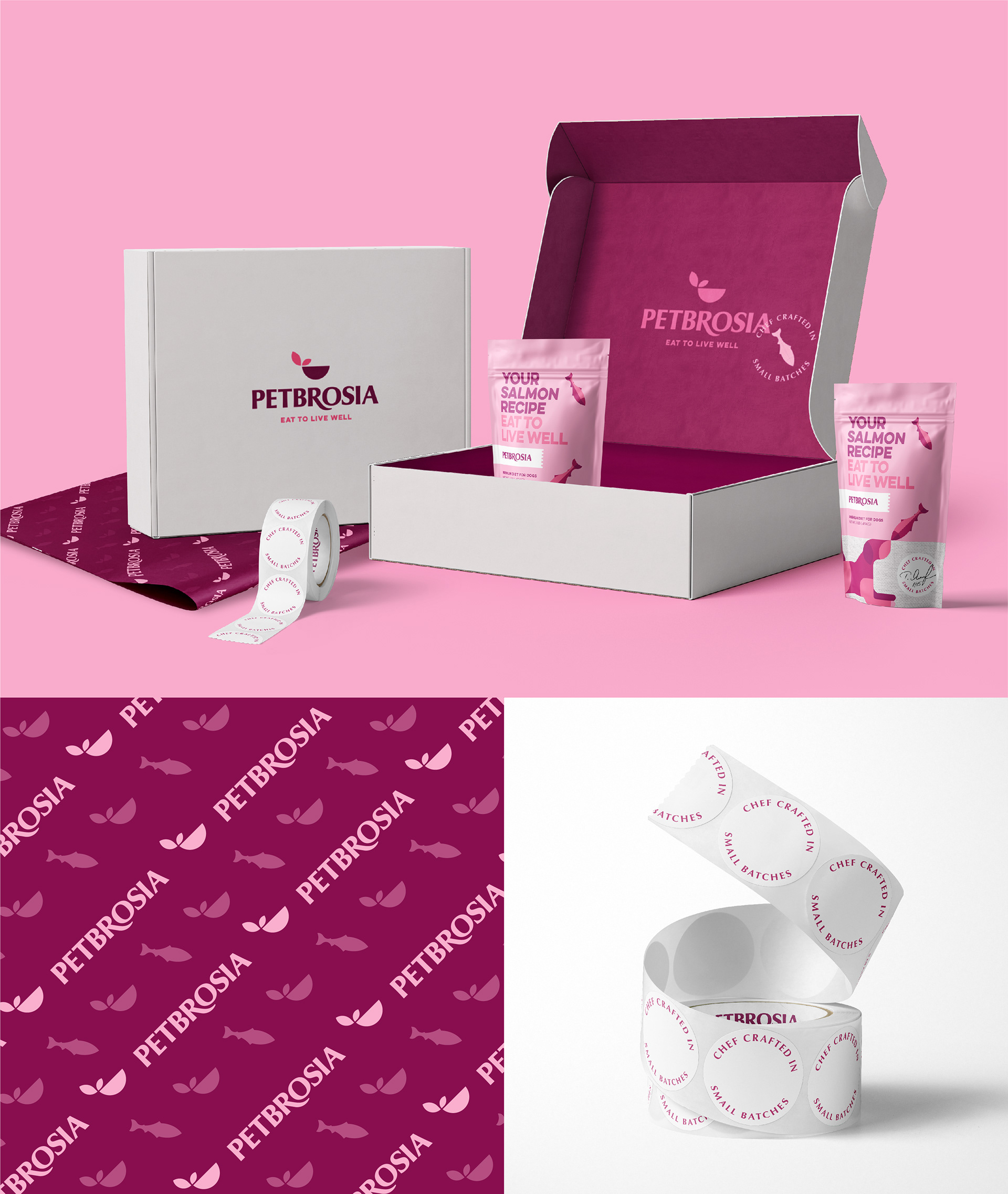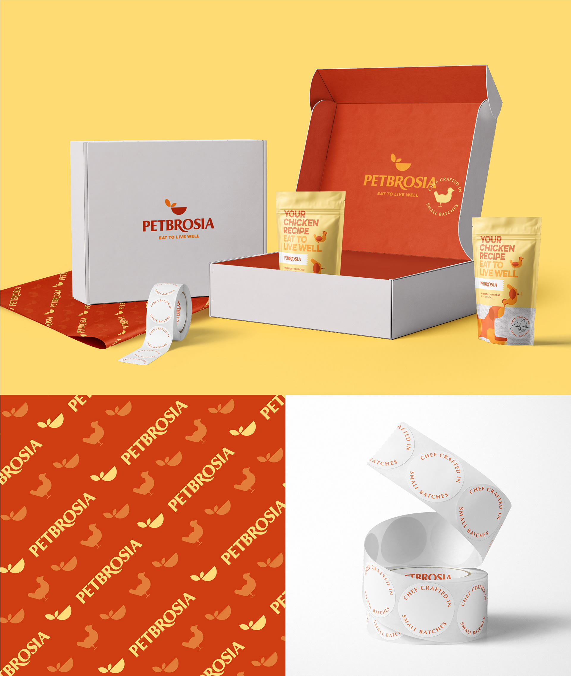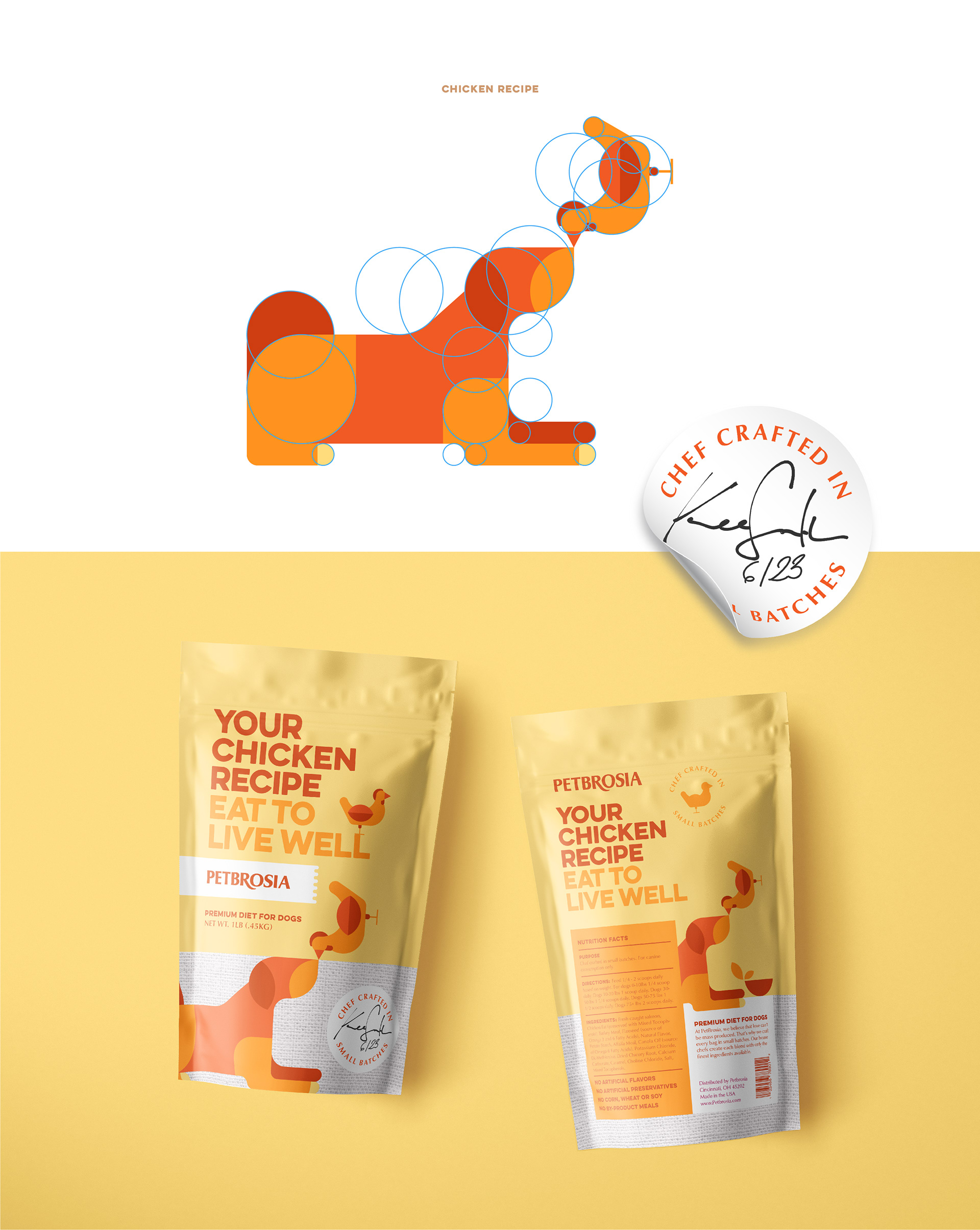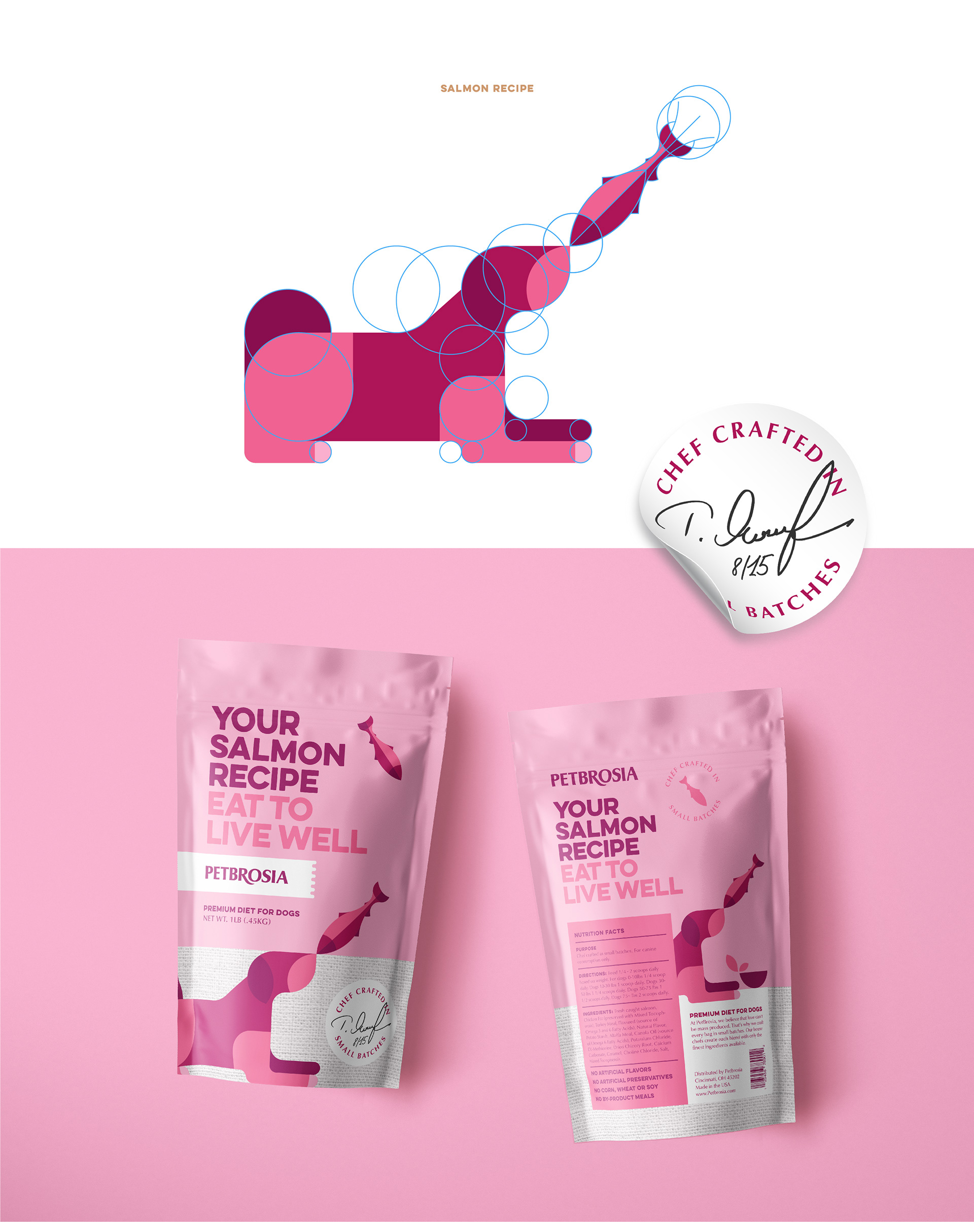 Branding and package design for chef made dog food brand Petbrosia.