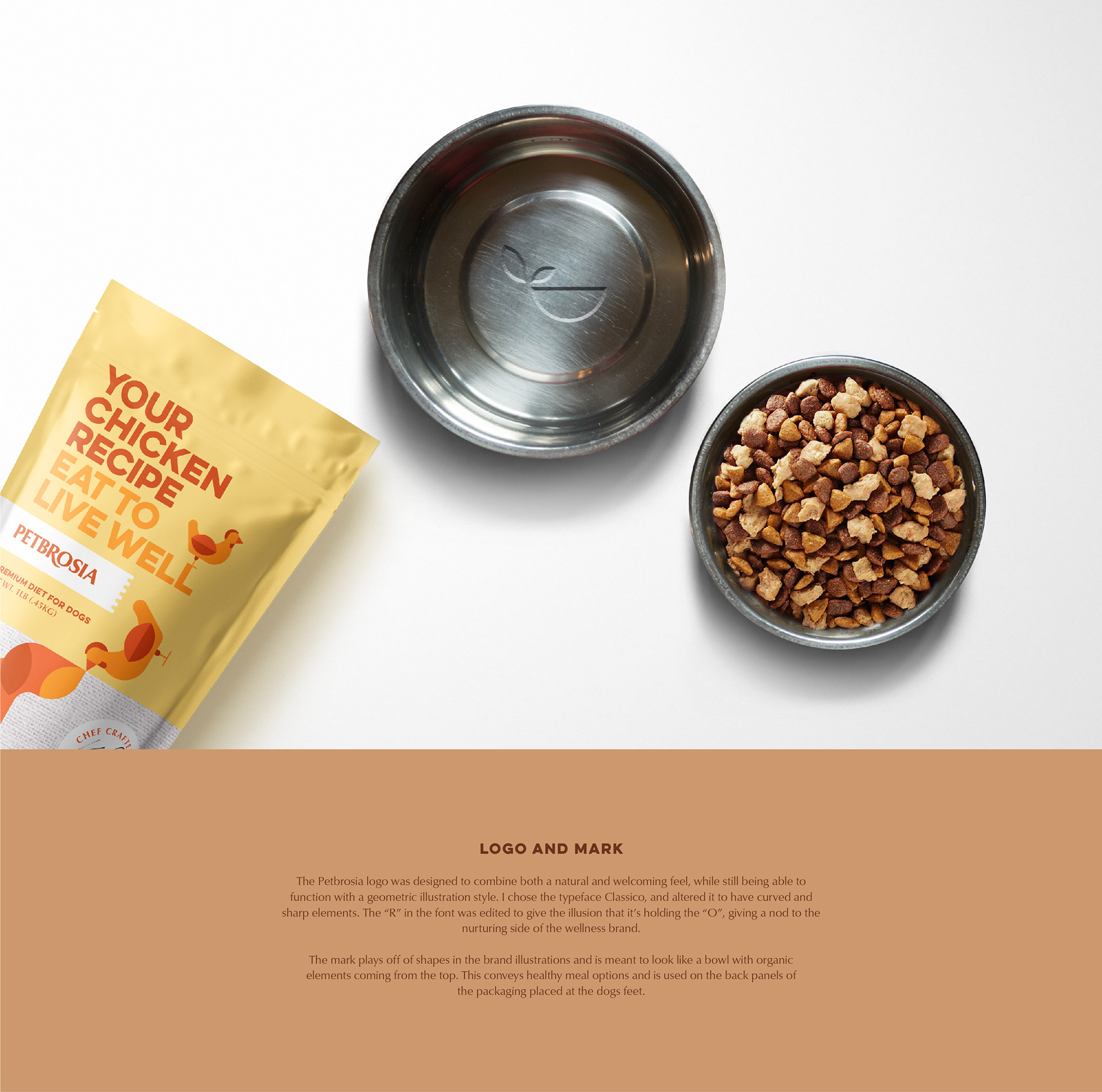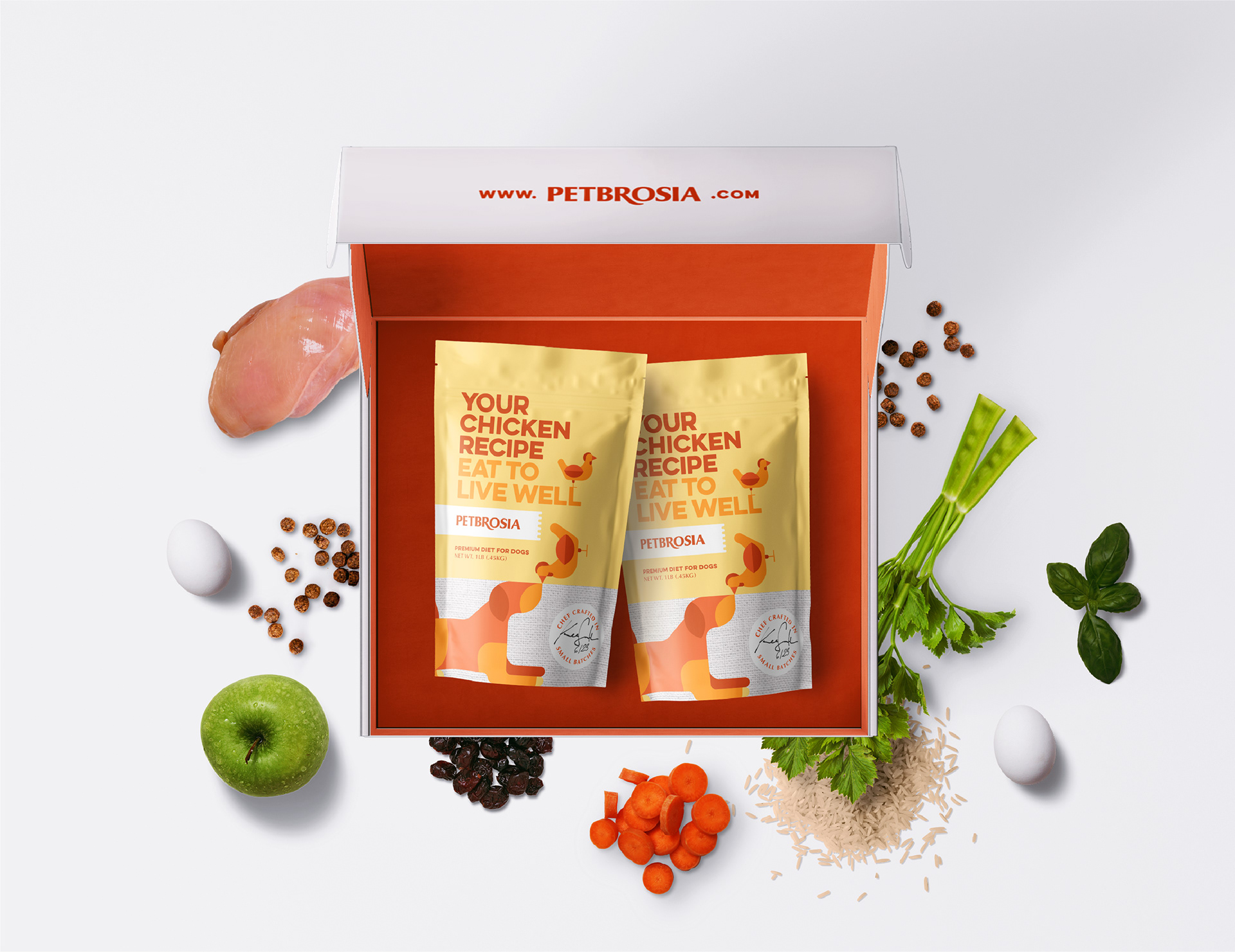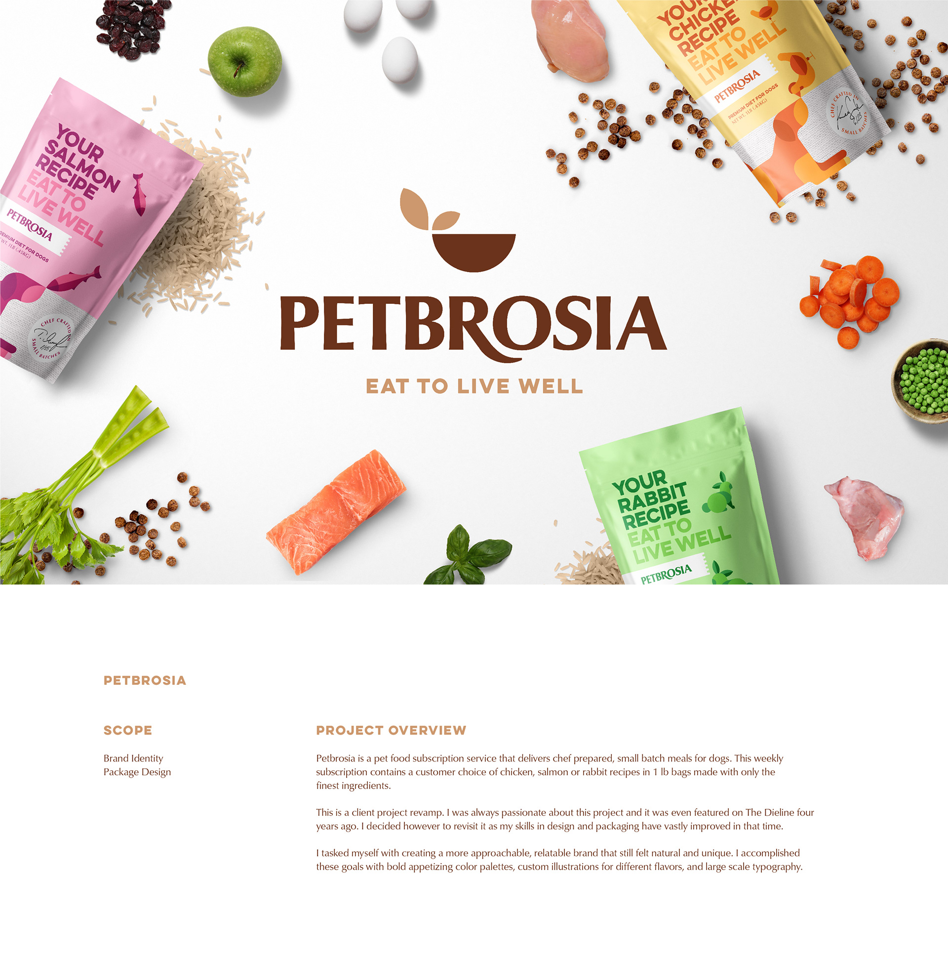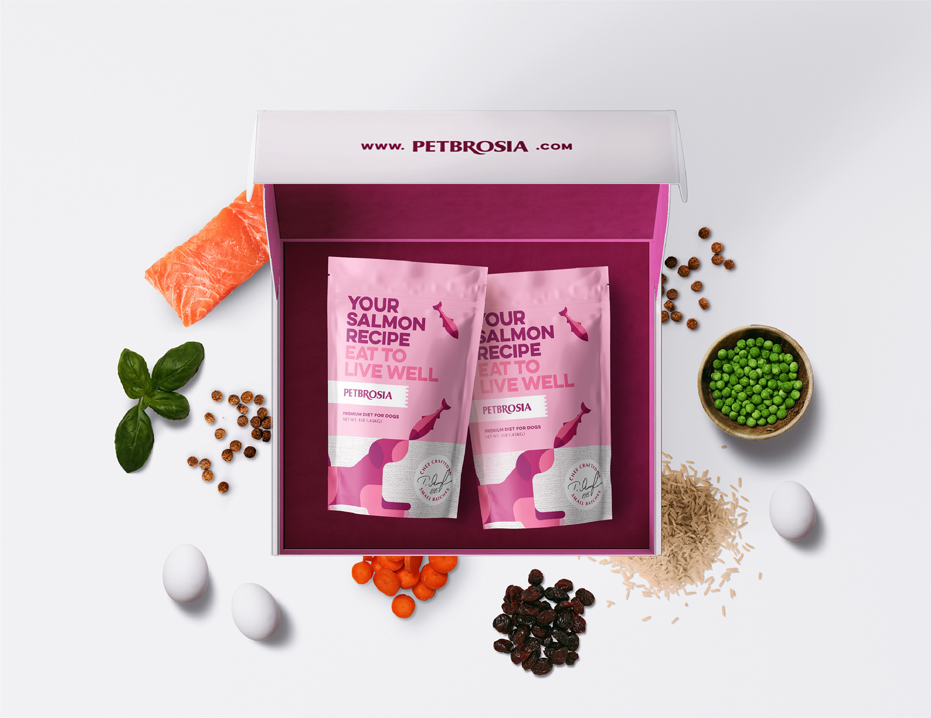 Branding and package design for chef made dog food brand Petbrosia.
