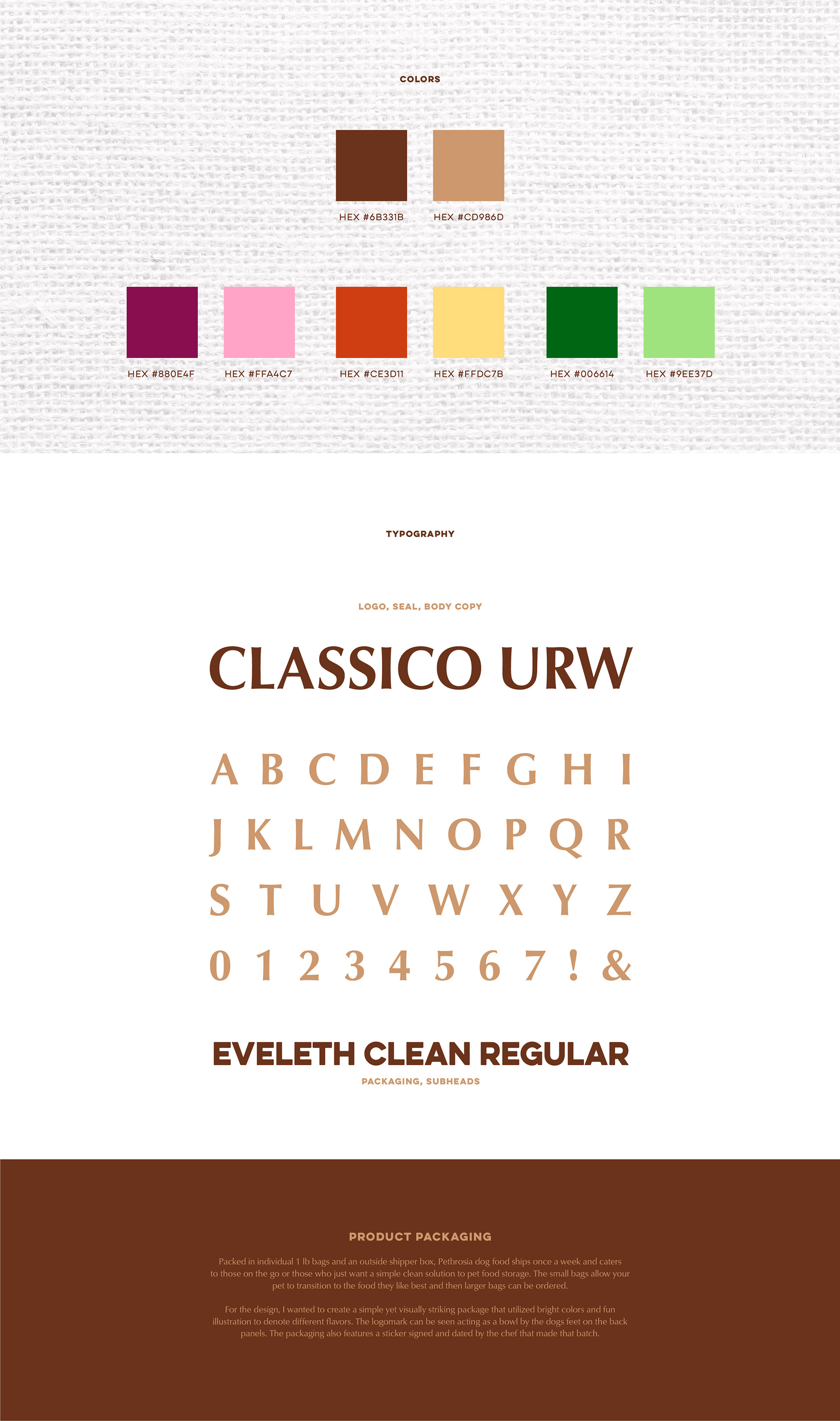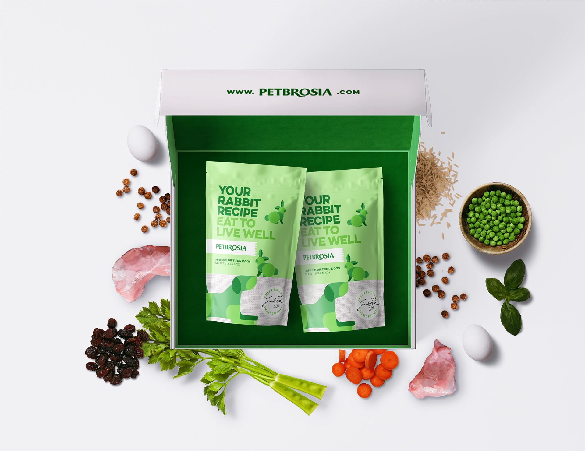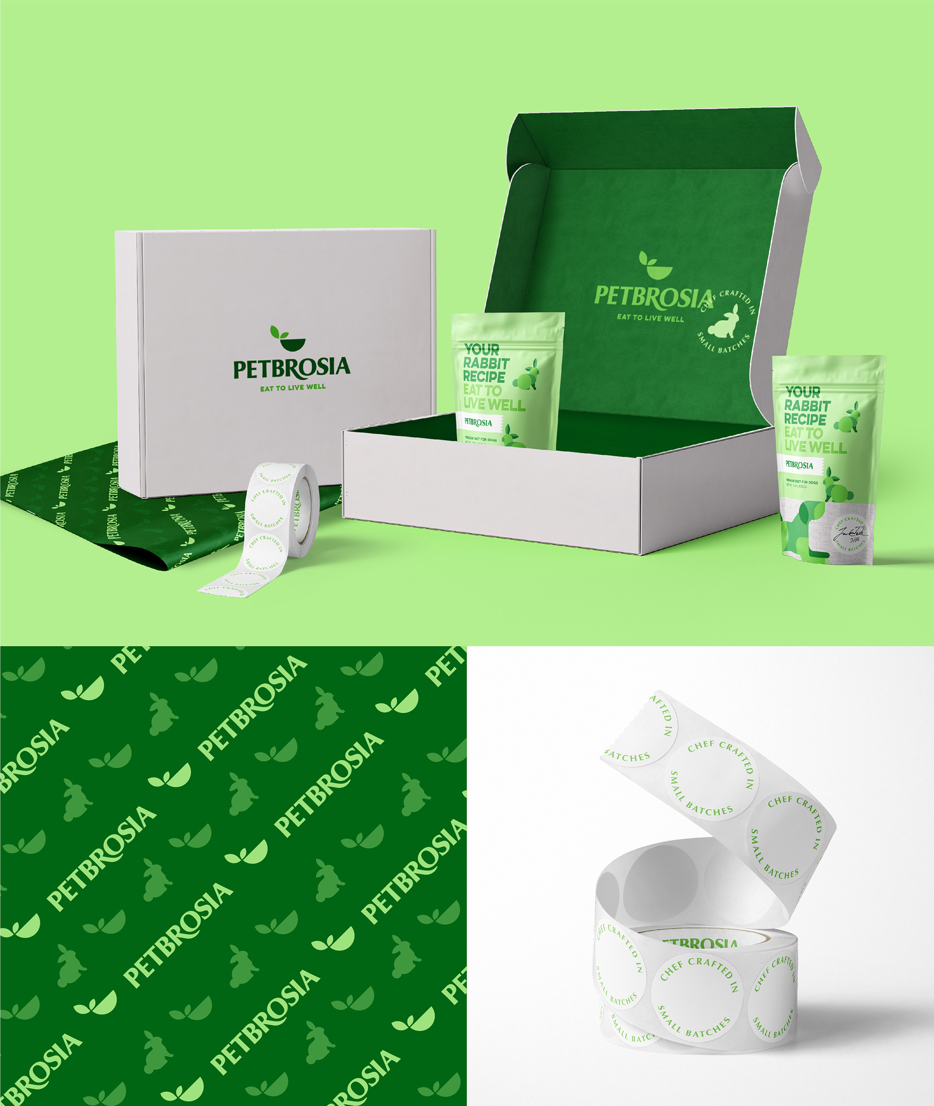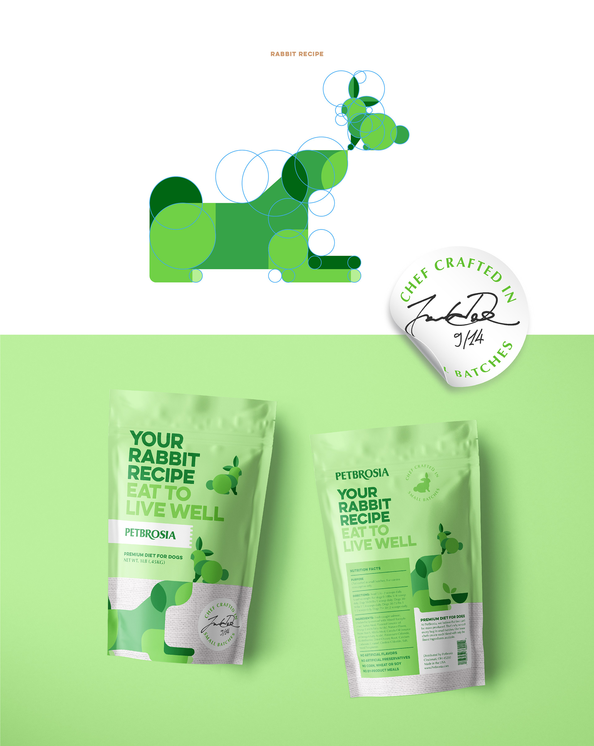 Branding and package design for chef made dog food brand Petbrosia.